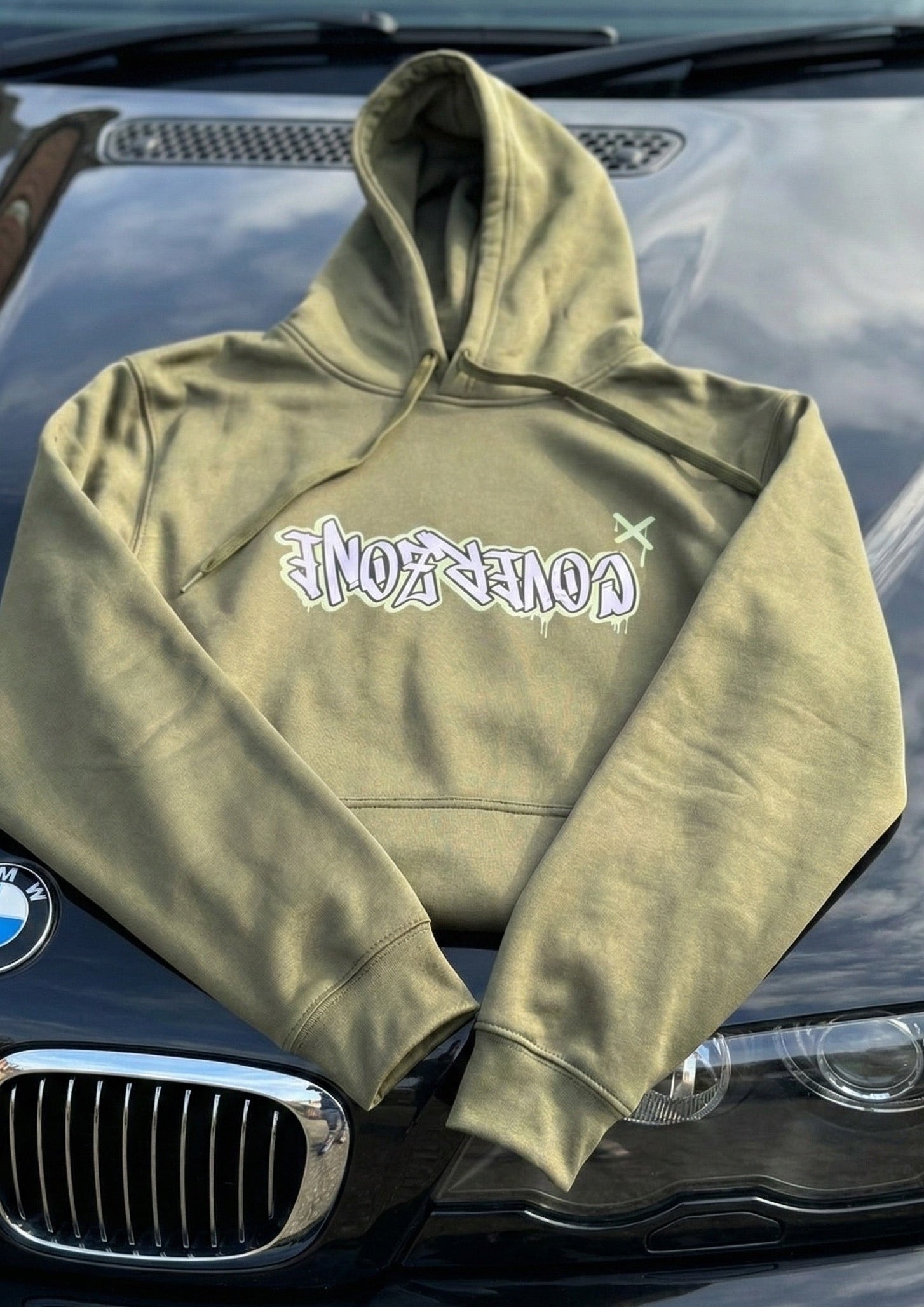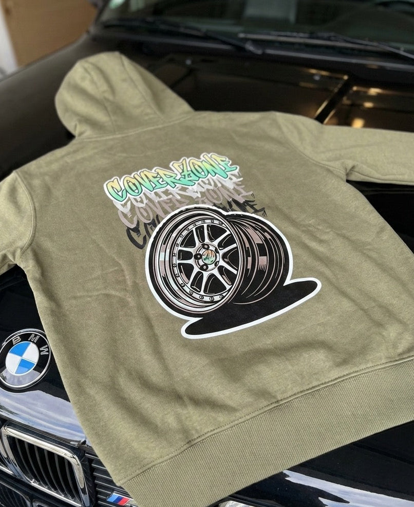 Sweat capuche Vert Kaki avec logo graffiti et une jante a deport